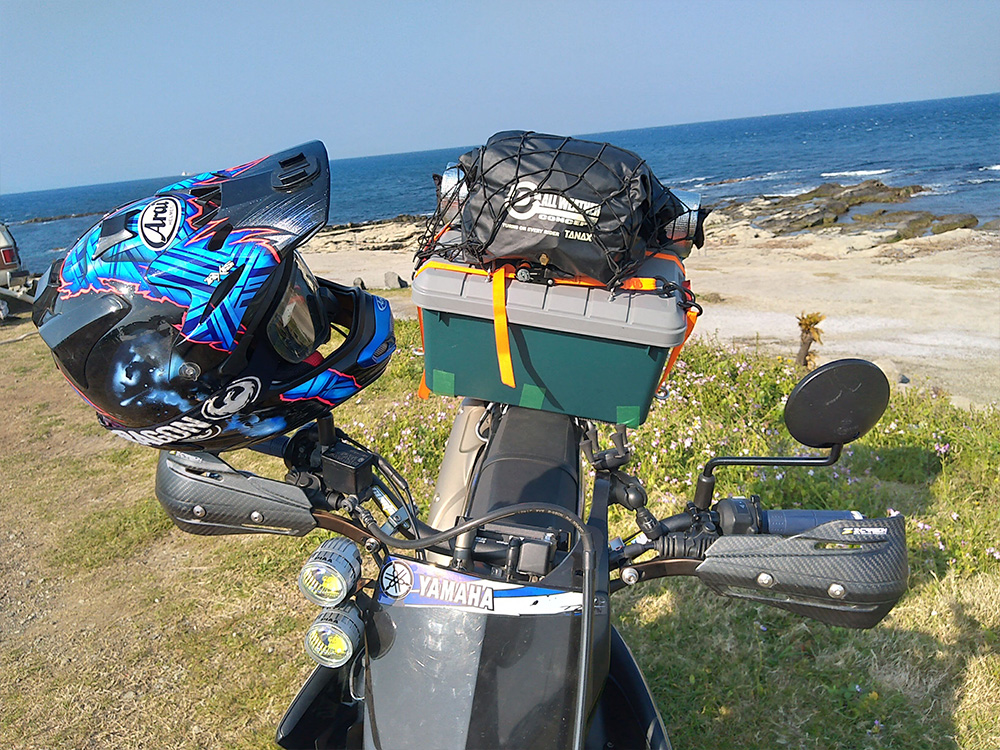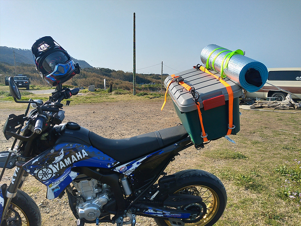 筆者はバイクの荷台を木材で拡張して積載装置を横に伸ばしています。